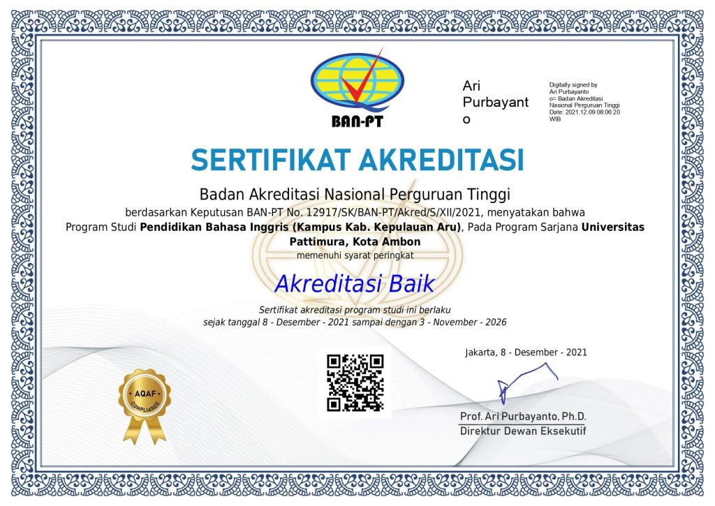 Berdasarkan Keputusan BAN-PT No. 12917/SK/BAN-PT/Akred/S/XII/2021, menyatakan bahwa Program Studi Pendidikan Bahasa Inggris (Kampus Kab. Kepulauan Aru), Pada Program Sarjana Universitas Pattimura, Kota Ambon memenuhi syarat peringkat Akreditasi Baik